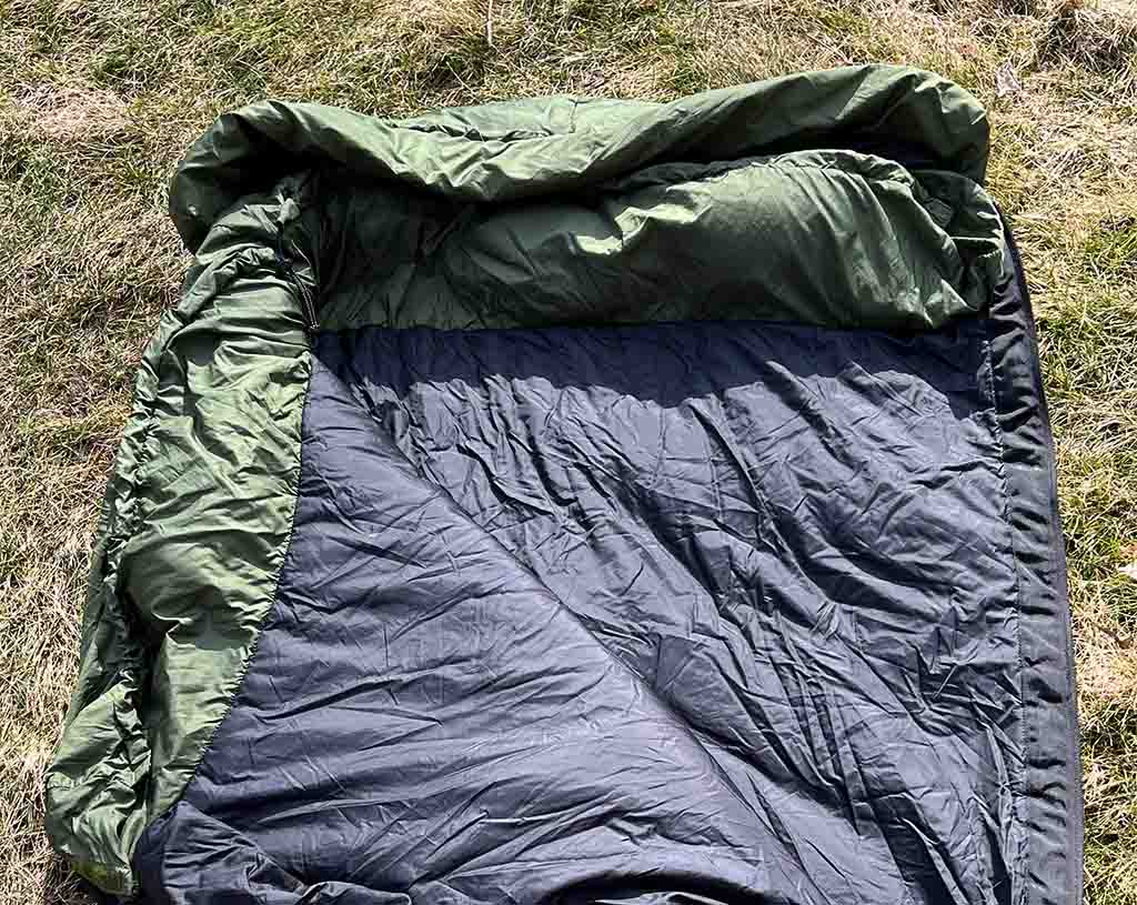 2.5 layers of 4 oz Primaloft Silver insulation and 2 layers on bottom of bag, 30 denier Pertex Microlight outer shell fabric; 30 denier taffeta lining (black)