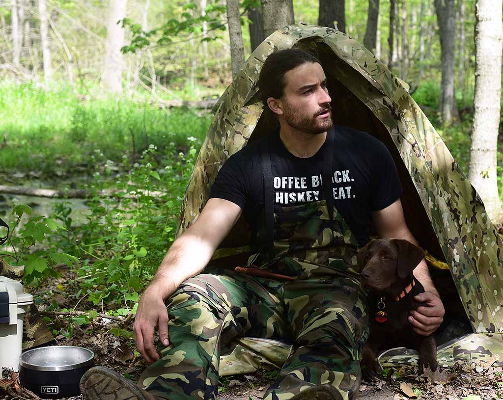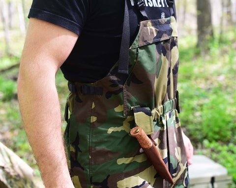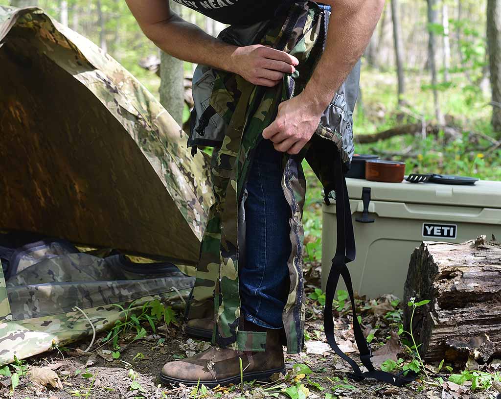 Reinforced articulated knees; Fully separating YKK # 5 2-way separating leg zippers with double storm flaps (can be put on over boots); Two large thigh cargo pockets ending at top of knee; Heavy duty adjustable suspenders with side release buckles; Gun belt loops; Fly zip: hook and loop tightener at pant hem: Choice of semi bib or full bib with zippered chest pockets. Multicam and Realtree versions will be made using colour matching hardware. Will be made with colour matching hardware on the Multicam and Realtree versions.